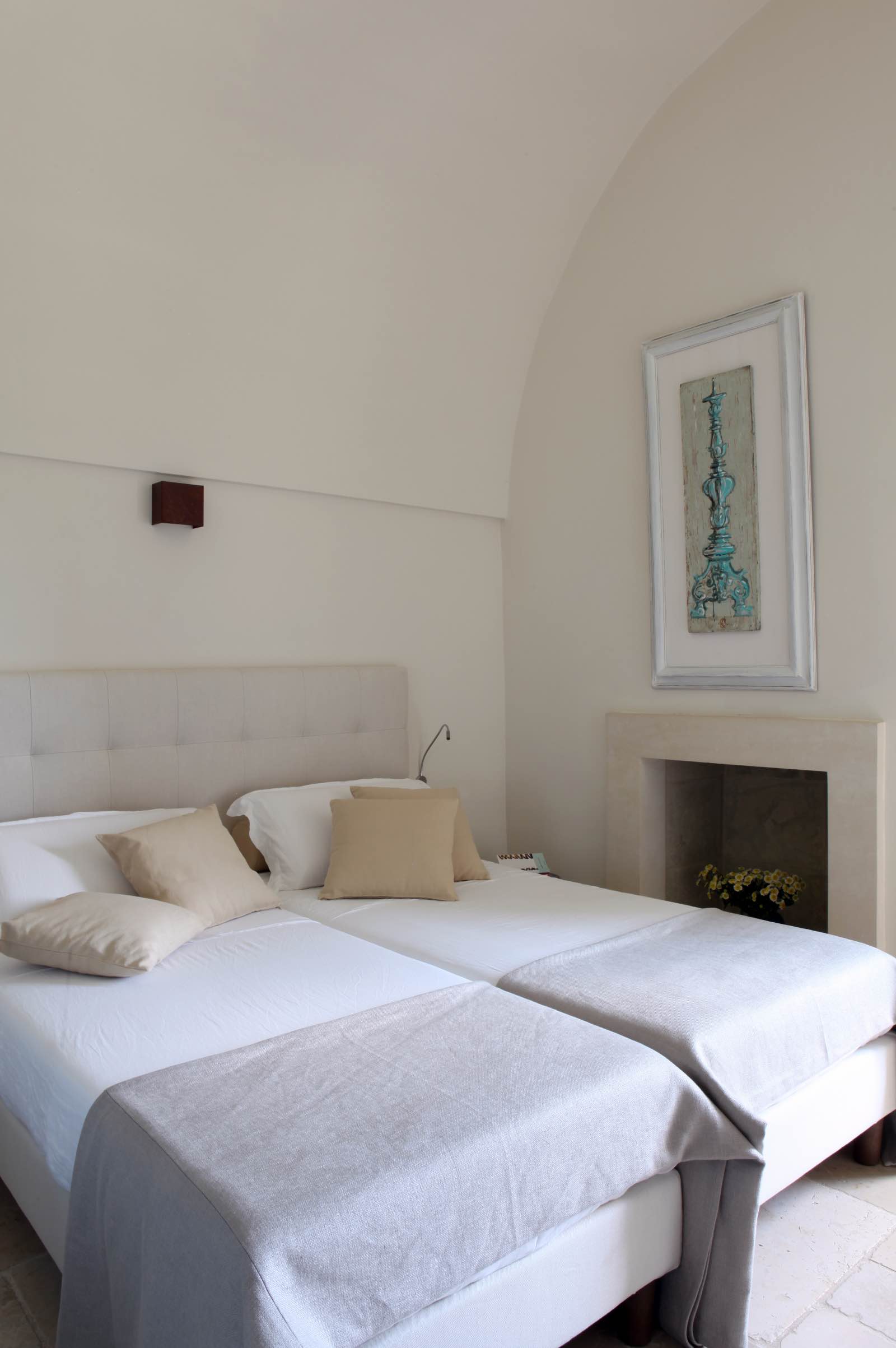 Questa Suite sorge in un piccolo fabbricato adiacente l’ingresso principale ed indipendente dal corpo centrale della Masseria. Arredata finemente e dotata di ogni comfort, la Suite degli Apolli è l’ideale per chi ha voglia di privacy ed intimità in totale relax immersi nelle lussuose comodità che solo in questa magnifica masseria è possibile trovare. La Suite degli apolli è suddivisa in due zone, come tutte le altre suite, ed un’ampia zona bagno con una doccia in una stanza separata dalla zona lavabo e dai sanitari.