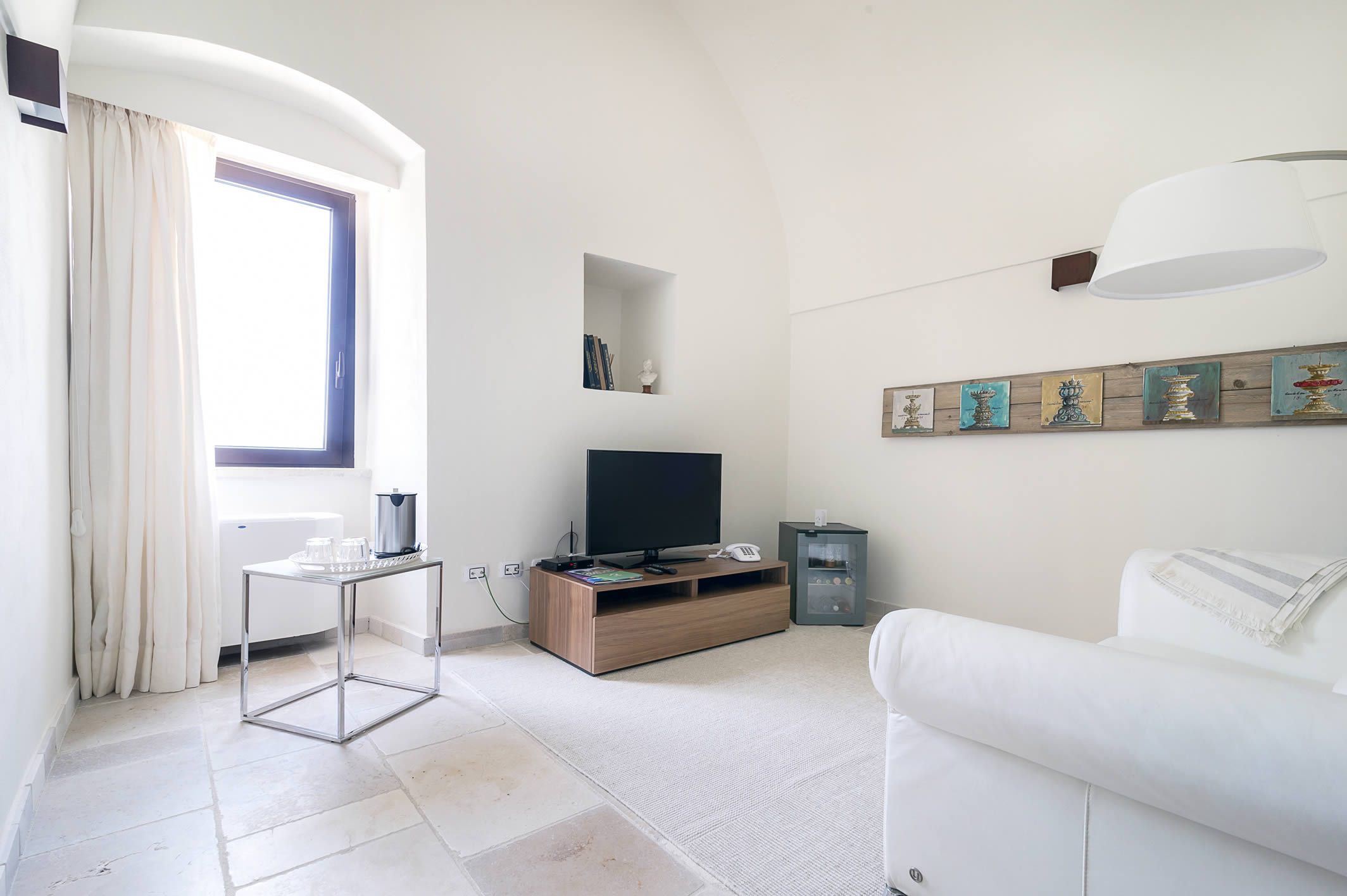 La Suite dei Capitelli è probabilmente la più suggestiva ed originale tra tutte le nostre suite. La sua particolare altezza interna ha permesso di creare un bellissimo soppalco su cui sorge la camera da letto. Nella parte inferiore invece, oltre allo splendido salotto che affaccia sull’atrio interno e sulla piscina, questa suite è l’unica che offre una vera e propria cucina autonoma ed un bagno con doppi lavandini. Arredata finemente, con gusto ed attenzione ai particolari, la Suite dei capitelli è il nostro fiore all’occhiello. Particolare attenzione va posta nell’osservare i dettagli di tutte le nostre suite. Questa in particolare offre molte comodità ed una ampia zona living per godersi del tempo di qualità in puro relax.
